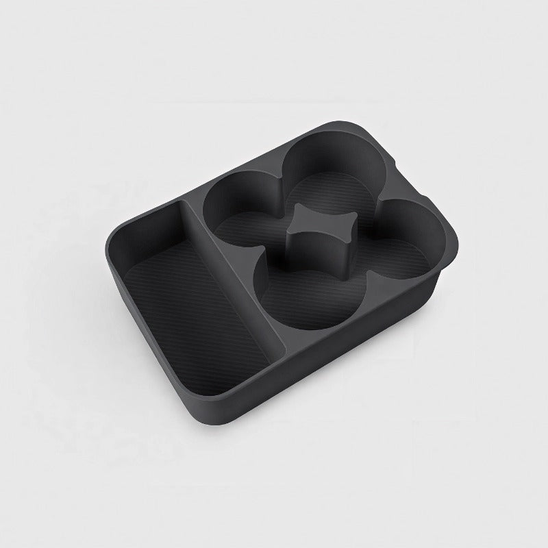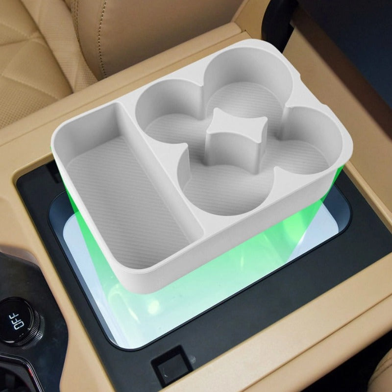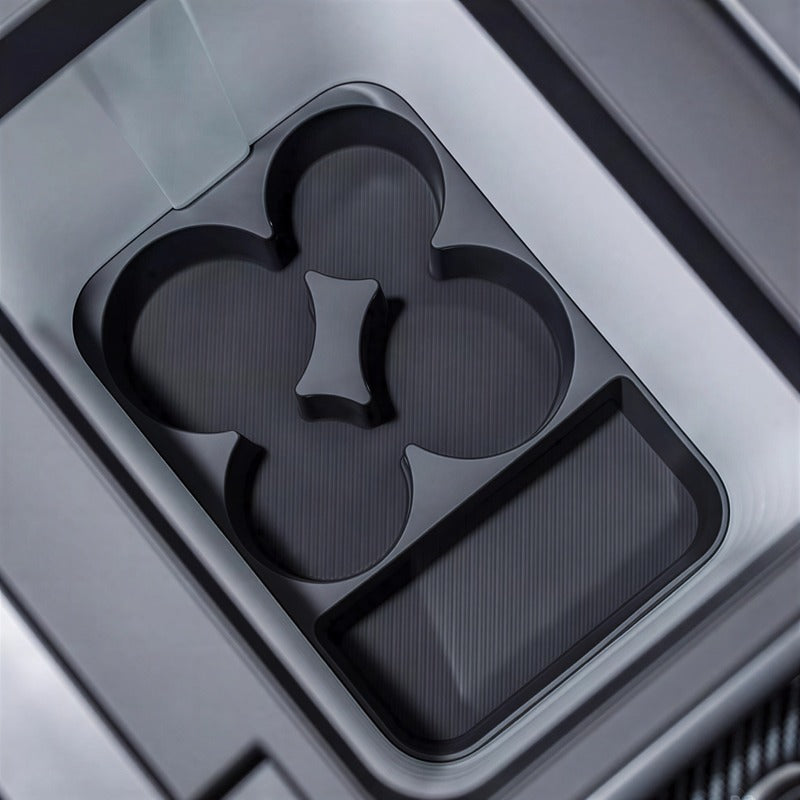 The tray features a thoughtfully divided design to securely hold drinks and small items, preventing movement or noise during driving. The smooth high-edge design helps prevent spills. It is removable for easy cleaning and can be installed or taken out effortlessly without any tools.