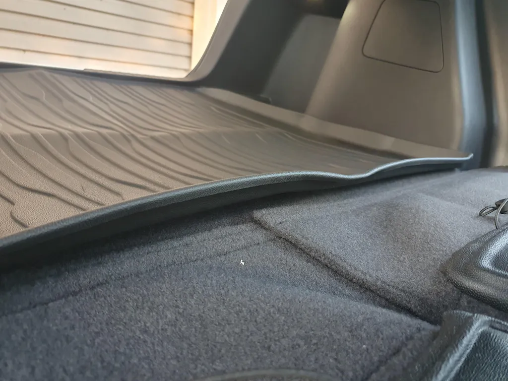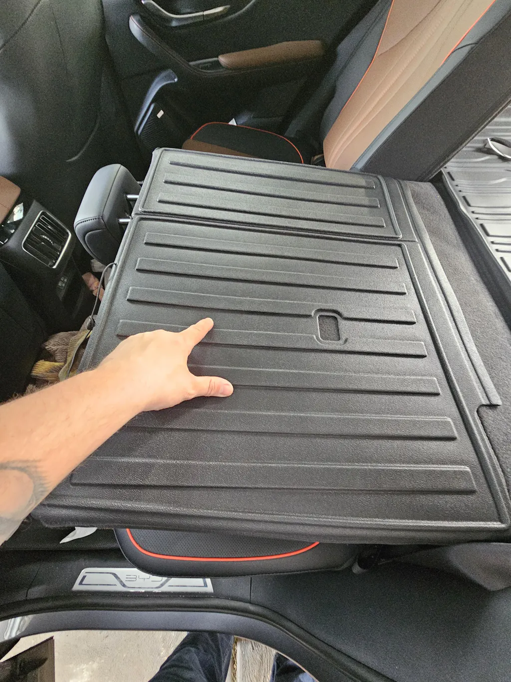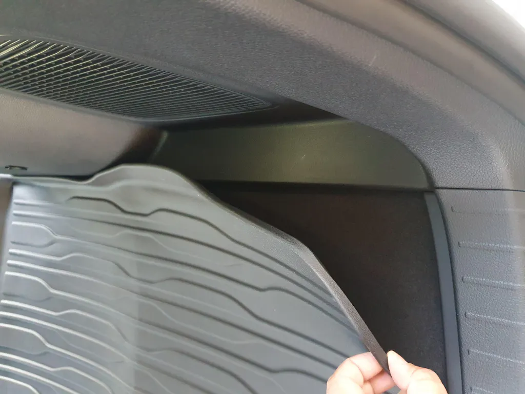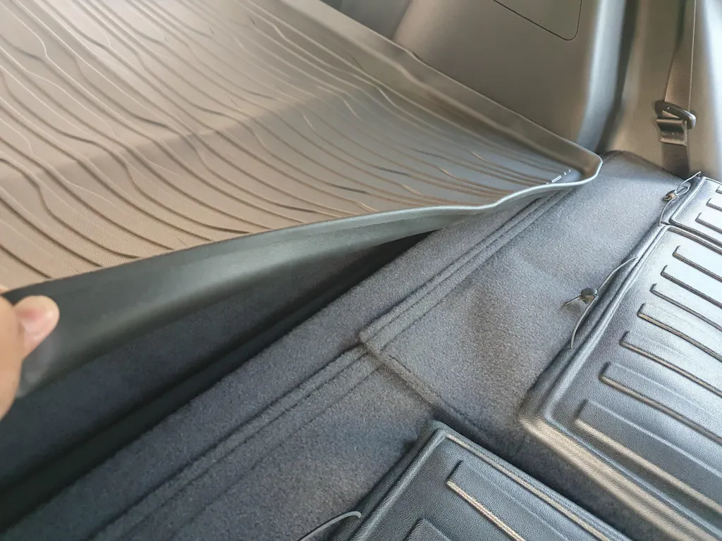 Before installing the trunk mat, you need to lift the partition underneath the trunk mat so that it aligns with the rear seats. This adjustment ensures the trunk mat fits properly. Once this is done, the trunk mat can be installed correctly.