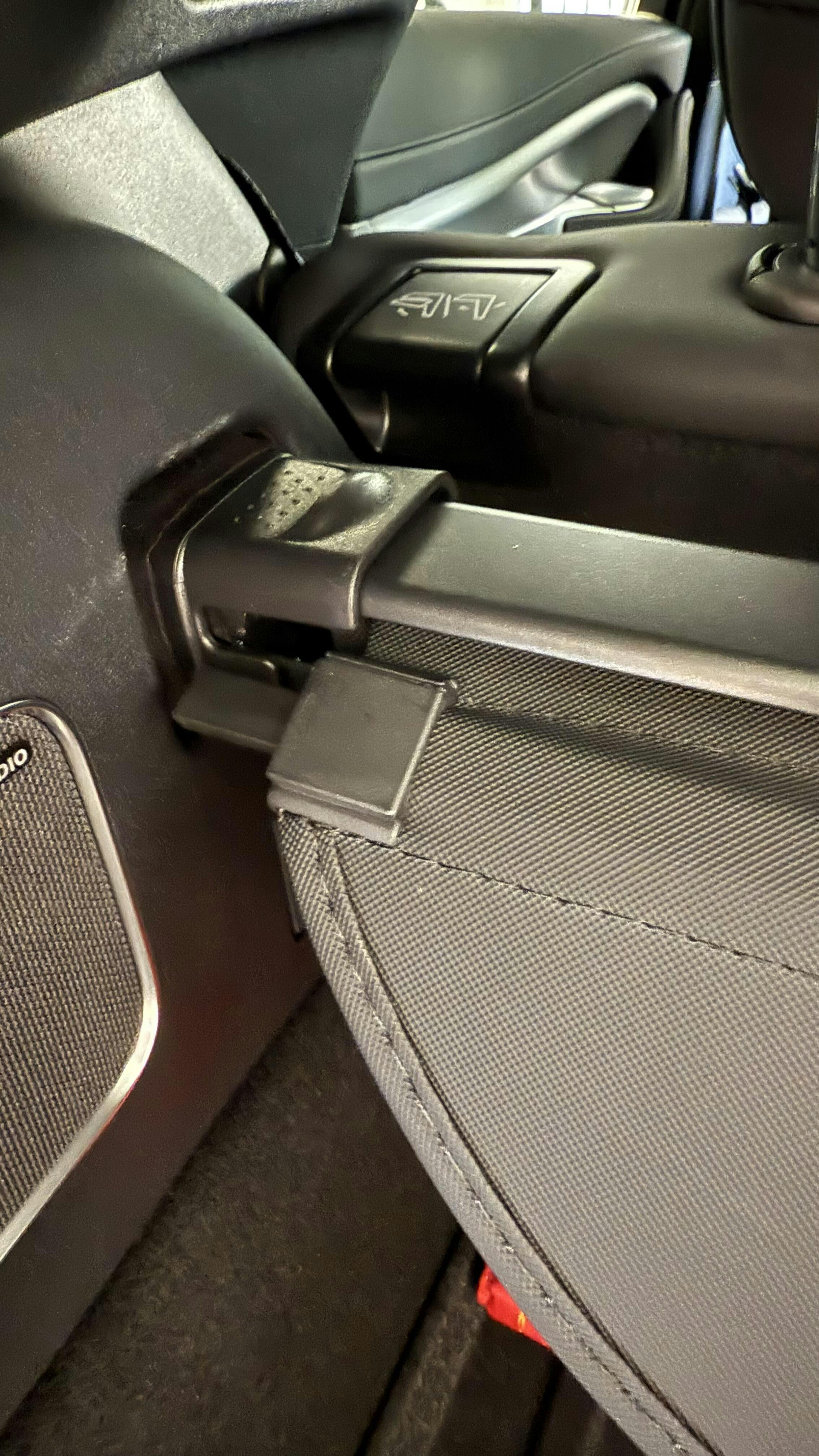 No display pictures or information in description showed the brackets on the rear headrest. So I ordered this one over a cheaper alternative because I thought it'd mean I could still fold forward the back seats. It does however require the brackets to be hung off the rear headrests. It works and seems to be well made but I was disappointed. They have since updated the discription after I contacted them with my concern.