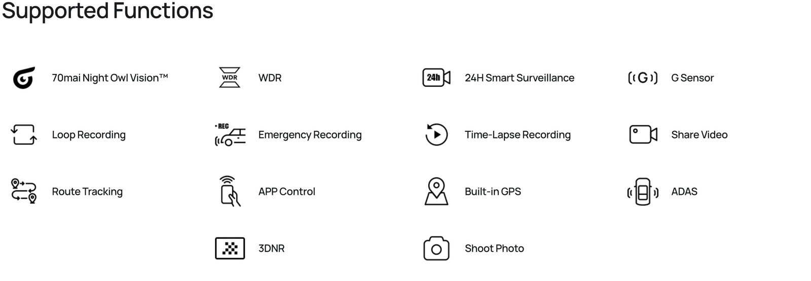 This dash cam model requires a power supply with 5V/2A input. It is recommended to use an official power supply accessories. If you prefer using a third-party power supply accessory, please make sure to opt for an accessory with power supply specifications that meet the requirements and comply with national safety regulations.